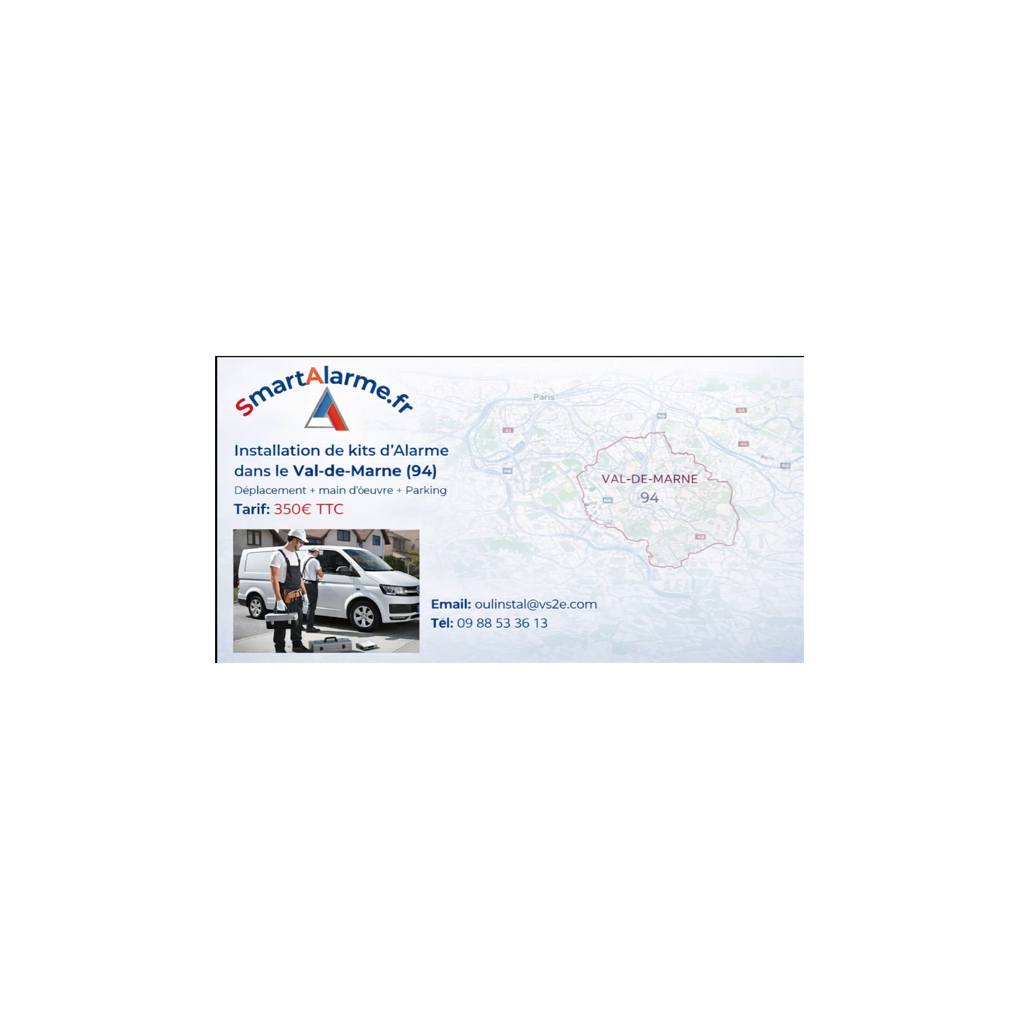 Installation de Kits d'Alarme dans le Val-de-Marne (94) incluant le déplacement, la main-d'œuvre et les frais de parking pour un tarif compétitif de 350 € TTC.