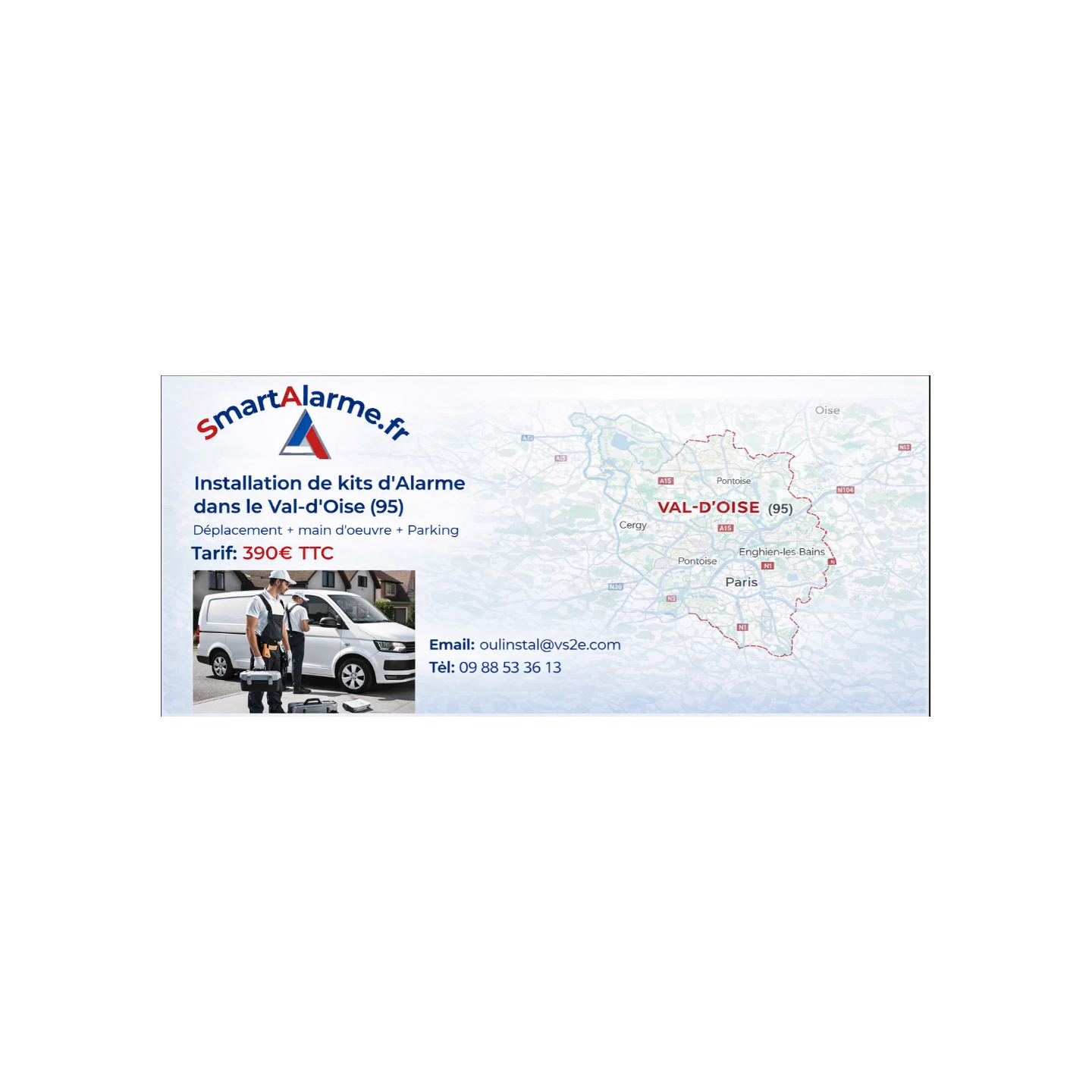 Installation de Kits d'Alarme dans le Val-d'Oise (95) incluant le déplacement, la main-d'œuvre et les frais de parking pour un tarif compétitif de 390 € TTC.