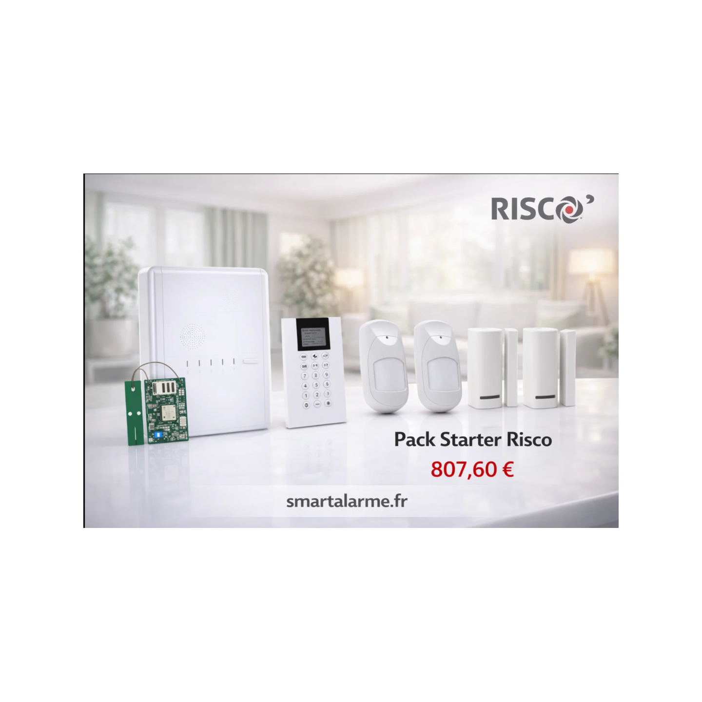 Le Pack Starter Risco prêt à poser inclut une centrale Agility, un clavier sans fil RW332KPP800E, deux détecteurs de mouvement RWX95P86800D, trois contacts de porte RWX73M86800D et un module IP RP512IP0000A. Une solution performante et simple à installer pour sécuriser efficacement vos biens.
