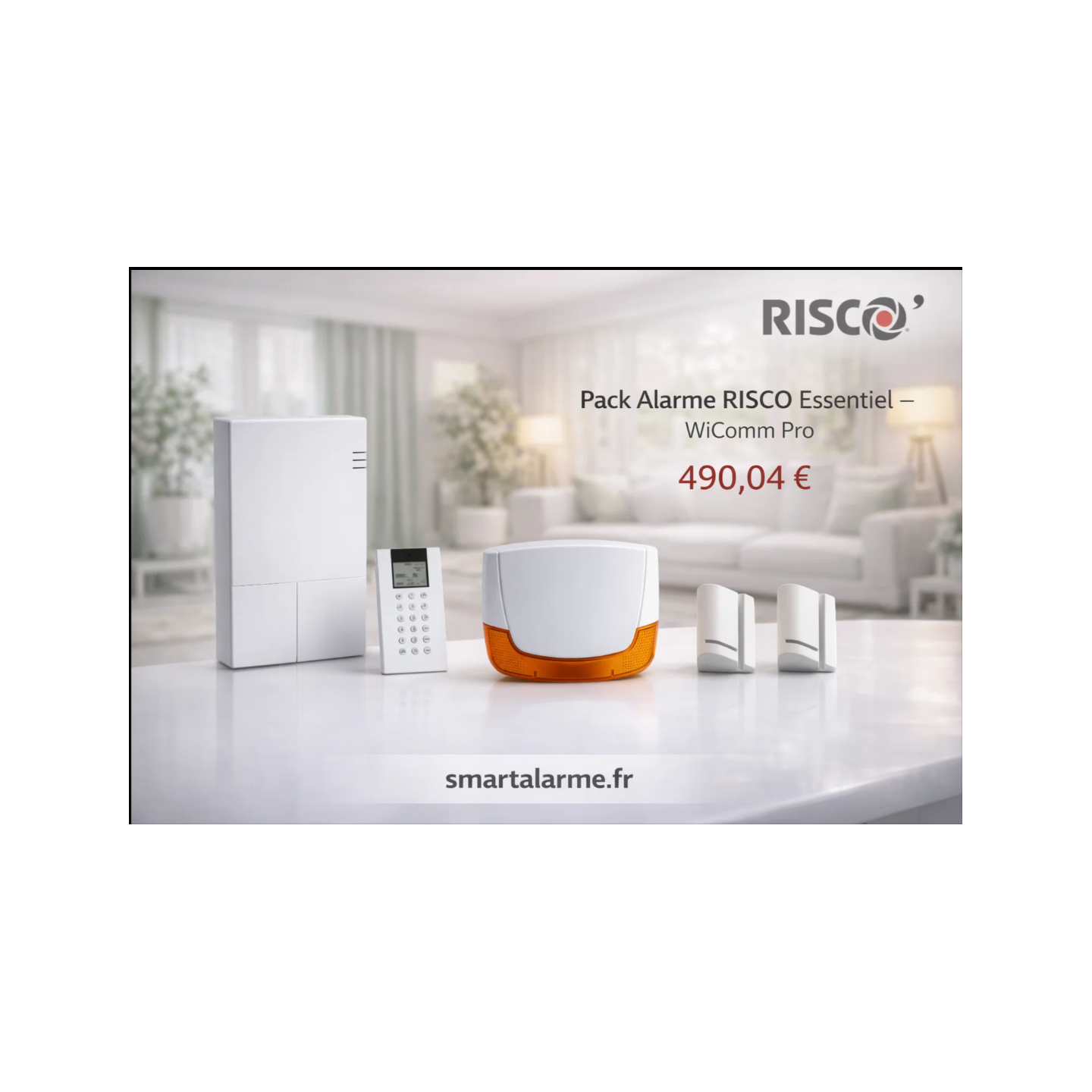 Pack Alarme Risco Essentiel complet : 1 centrale WiComm Pro, 1 clavier filaire Panda avec badge, 1 sirène extérieure LuMIN8, 1 télécommande bidirectionnelle, 2 contacts magnétiques sans fil. Système évolutif et pilotable à distance via l’application iRISCO. Idéal pour sécuriser maison ou local professionnel.