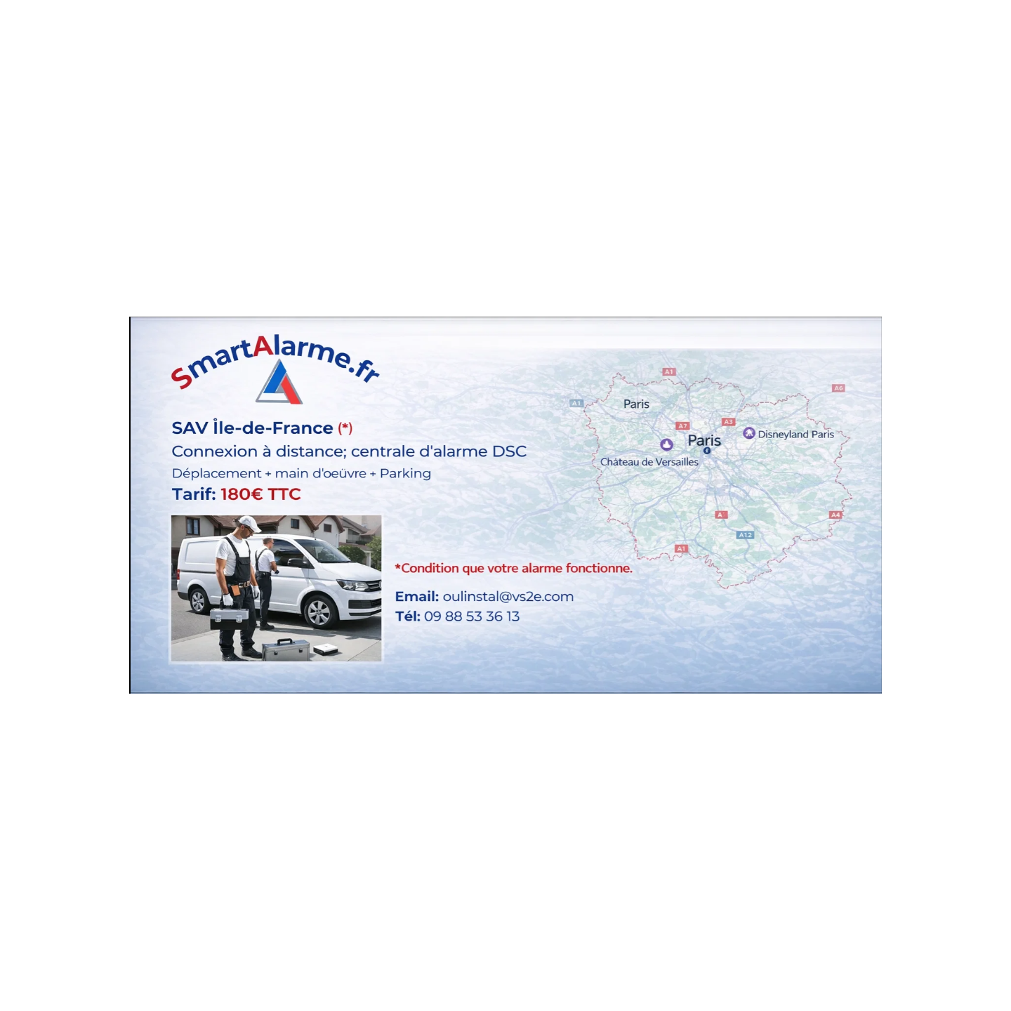 Ce forfait couvre l’intégralité de l’intervention, sous réserve que votre système d’alarme soit en état de fonctionnement (boîtier alimenté, ligne active, etc.).