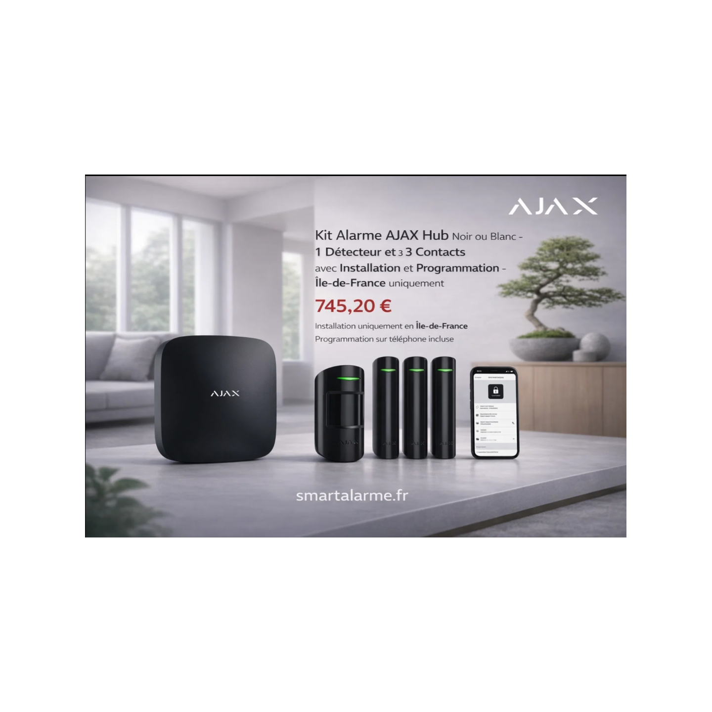 Kit alarme AJAX sans fil comprenant une centrale Hub, un détecteur de mouvement et trois contacts d’ouverture. Installation, programmation et configuration sur smartphone incluses. Intervention uniquement en Île-de-France.